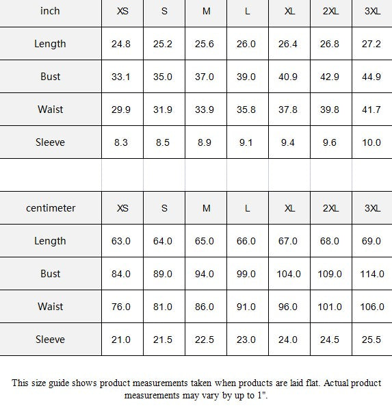 This size guide shows product measurements taken when products are laid flat. Actual product measurements may vary by up to 1".